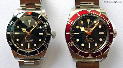 Auf der anderen Seite war der Tudor eindeutig als moderne Uhr entworfen, anstatt ein wörtliches Remake, aber mit einem Design, das Elemente von Vintage Tudor Taucheruhren beinhaltet. Es ist umso umfangreicher und größer, bei 41 mm Durchmesser.